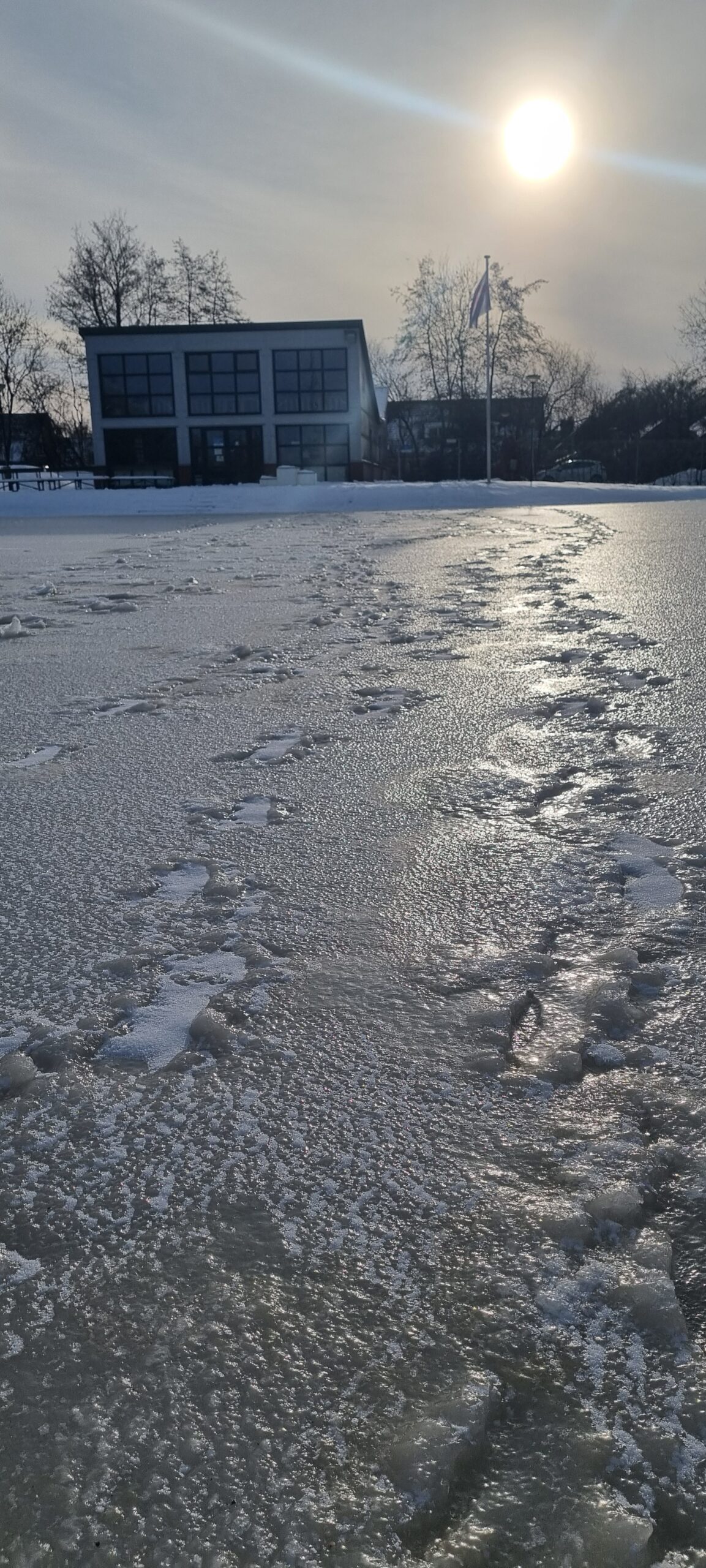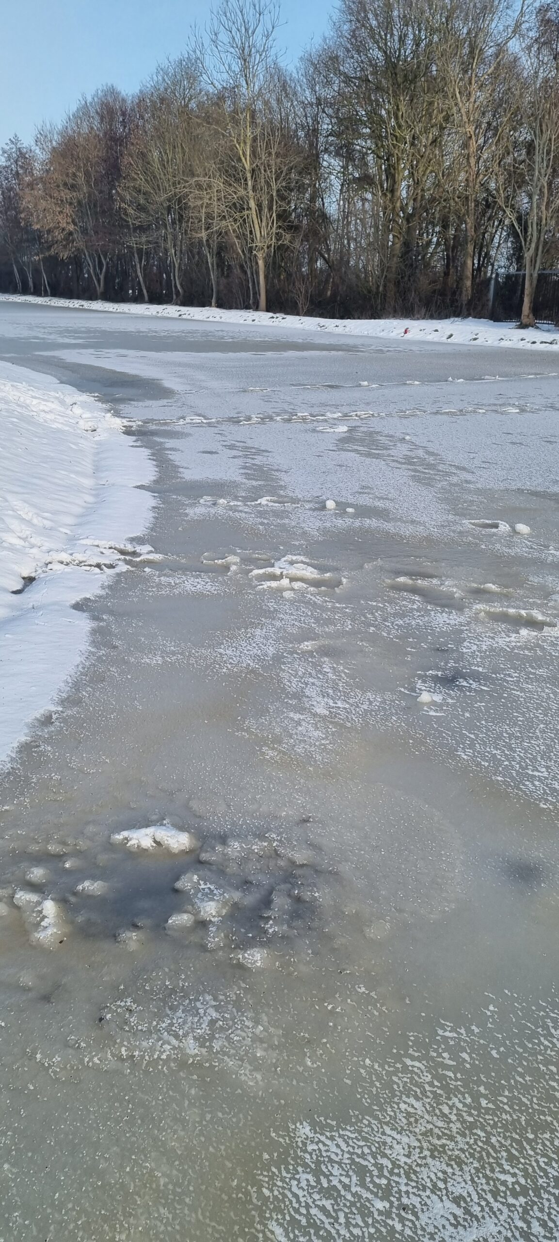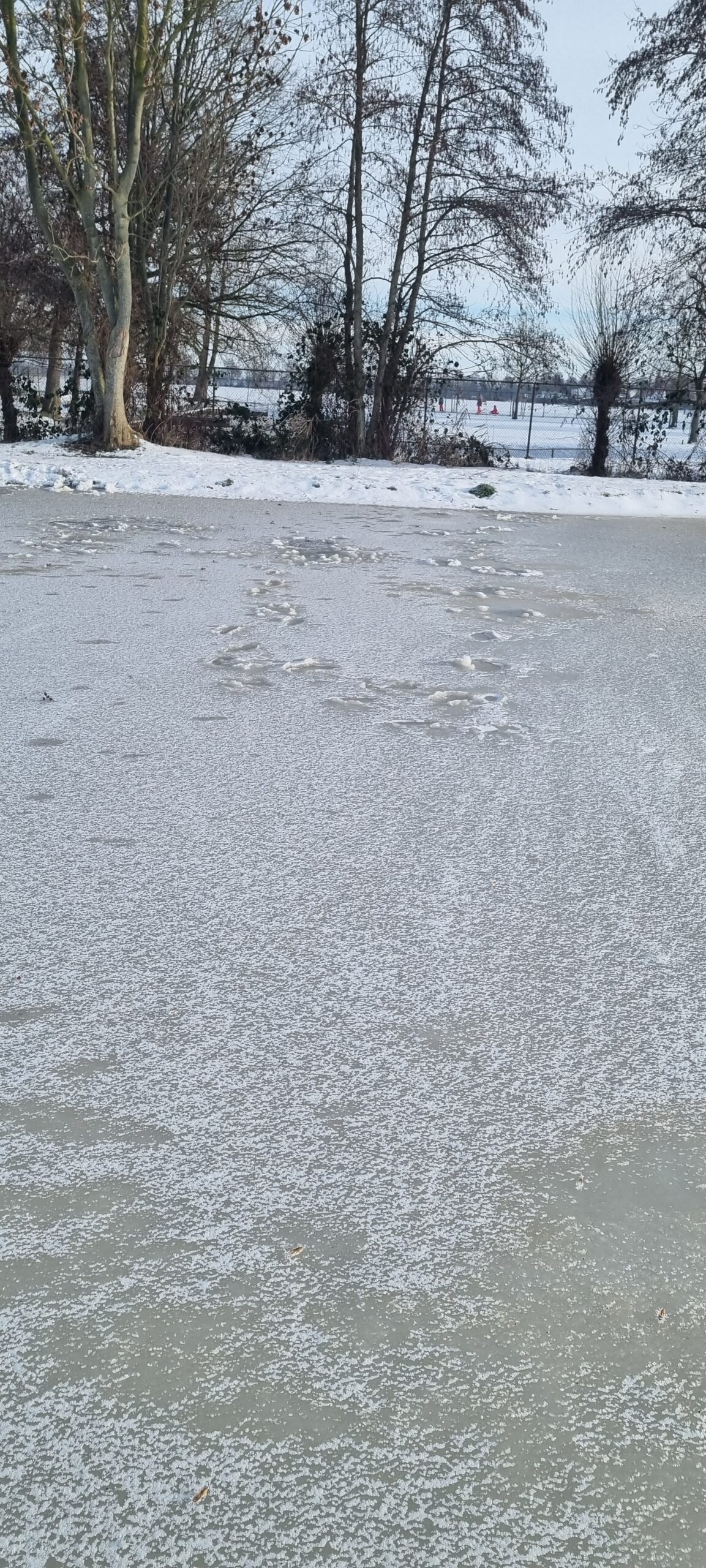 Ondanks dat het vannacht goed gevroren heeft en we hoopten op een prachtige ijslaag, moeten we toch slecht nieuws brengen. Helaas is er op verschillende plekken over de baan gelopen toen er sneeuw lag. Deze voetstappen zijn nu hard opgevroren.